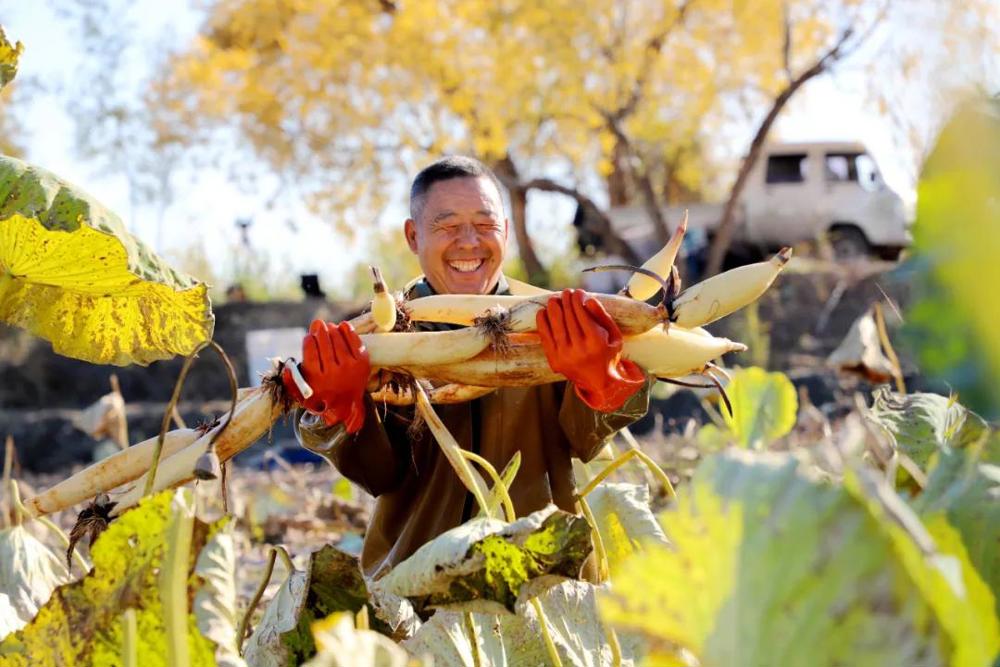“目前,一二九团香荷园的莲藕已经采收完毕,亩产700公斤~800公斤,一三〇团胡杨林的莲藕采收也已开始。今年,种植莲藕的净收入约七八万元。”张双说。