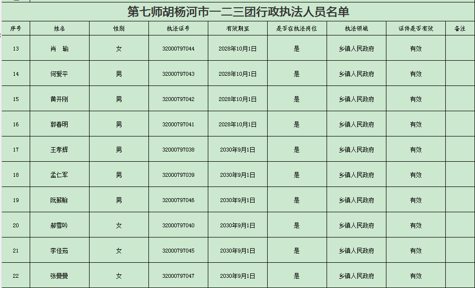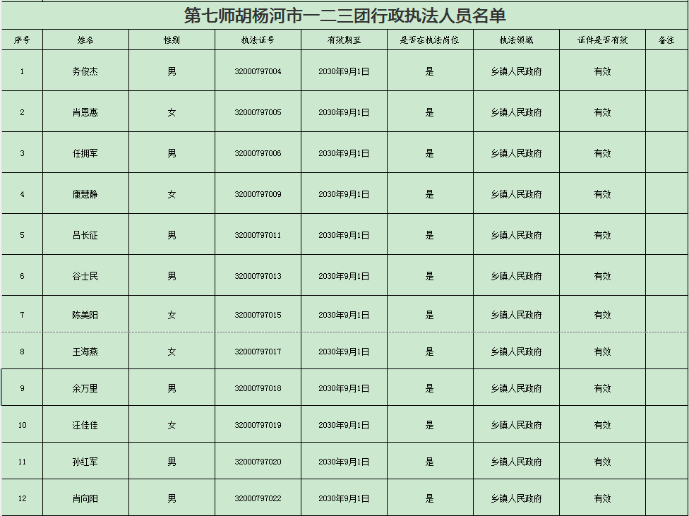 一二三团行政执法人员信息 发布时间:2025-12-31 17:01:10 浏览次数: 次 【字号:小 大】 202512311702475780.xlsx202512311702479115.png202512311702474028.png 终审:焦小明 打印正文 关闭本页